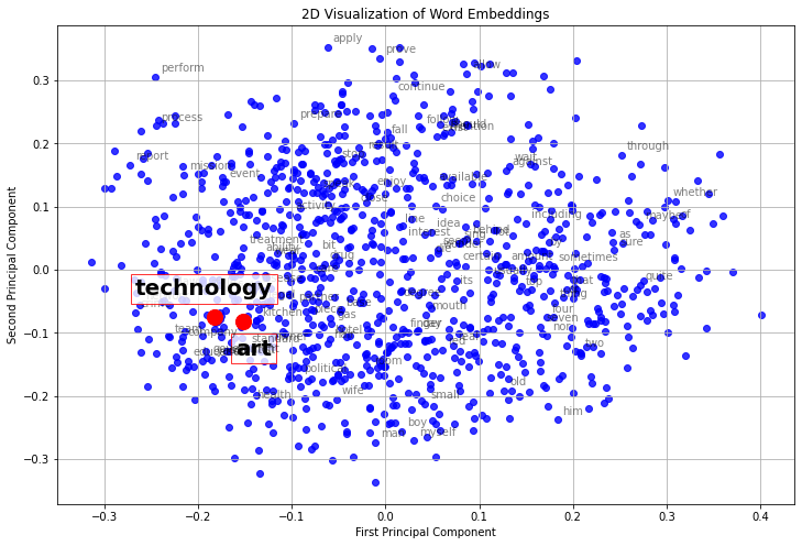 *Principal Component Analysis of text embeddings for the thousand most common English words, with 'art' and 'technology' highlighted in red. Closer words are more semantically similar.